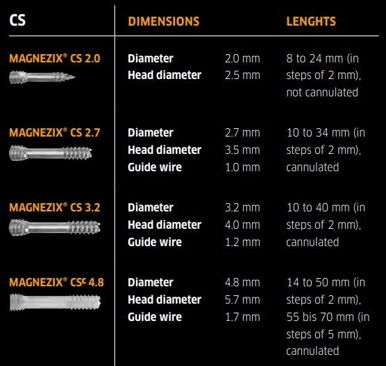 בורג מגנזיקס מתאים לכל ניתוחי השברים. הוא קיים באורכים של 8-70 מ"מ, עבור ילדים ומבוגרים.